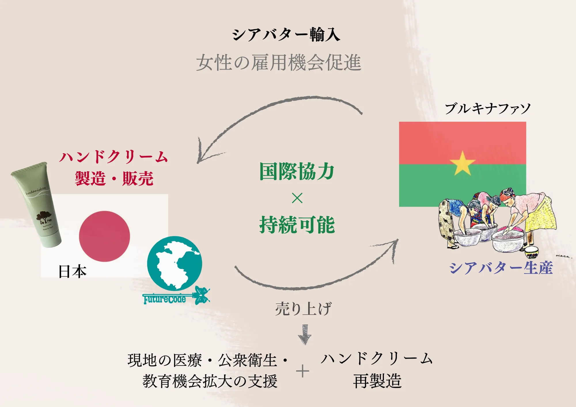 ブルキナファソの女性たちによって生産されたシアバターをハンドクリームに使用することで、さらなる雇用と現金収入を現地に創出します。各家庭における収入を増やすことで、一人一人に充てられる医療費・教育費の増加に貢献しています。また、ハンドクリームの販売から得られた利益は母団体Future Codeの医療・公衆衛生・食糧支援費およびハンドクリームの再生産費用に充てられます。そうすることで、継続してブルキナファソの貧困削減や乳幼児死亡率の改善に貢献できるよう取り組んでいます。