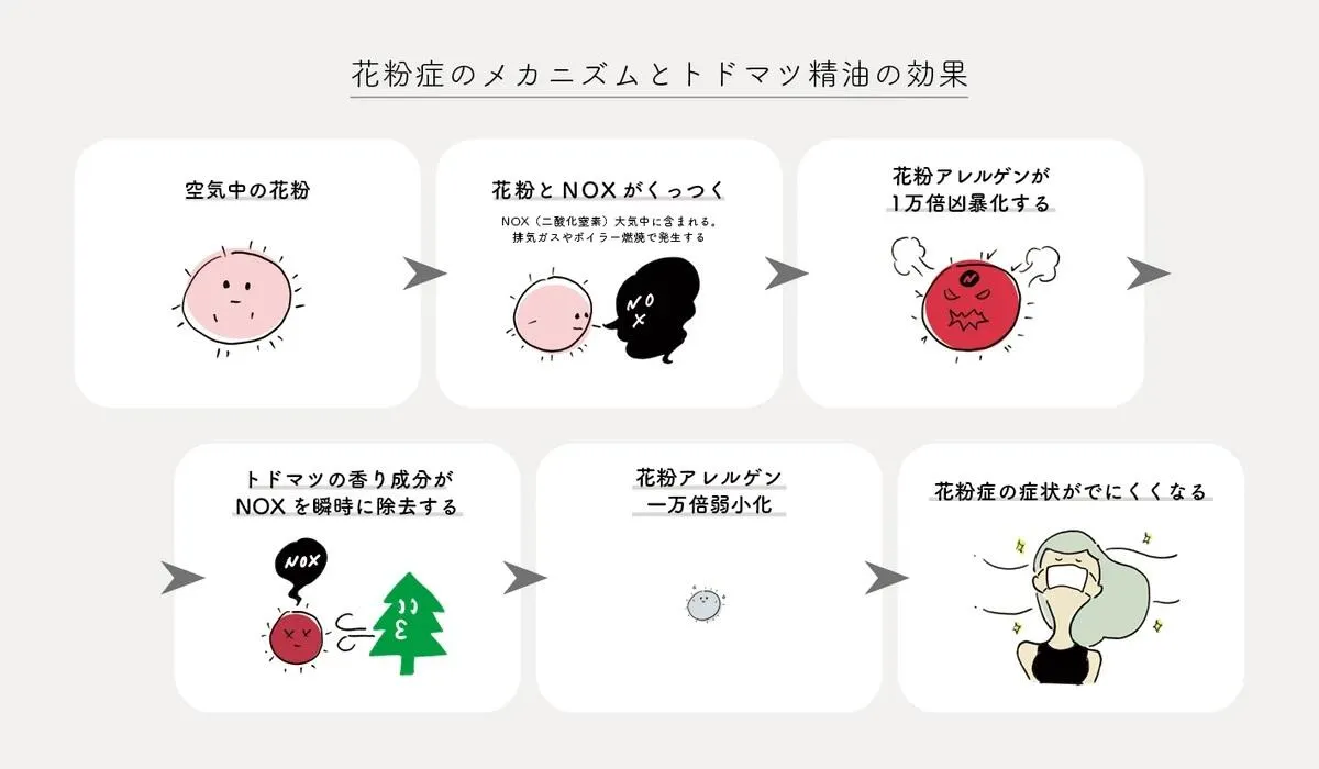 ニセコトドマツ精油(Ethereal Fir)には、極めて強い空気清浄、消臭、森林浴効果、花粉アレルゲンの無害化などの効果が見つかっています。