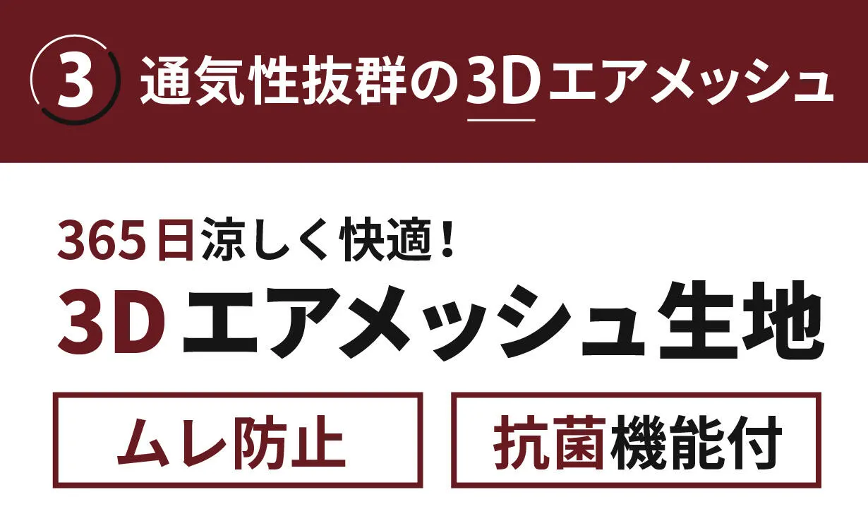 生地の特殊な糸構造で空気層を形成し、優れたクッション感で365日快適に使用頂けます。また、手のひらが透けて見えるほど通気性のある3Dメッシュ生地で肌が直接当たるのを抑え、空気が循環されて汗を防止します。