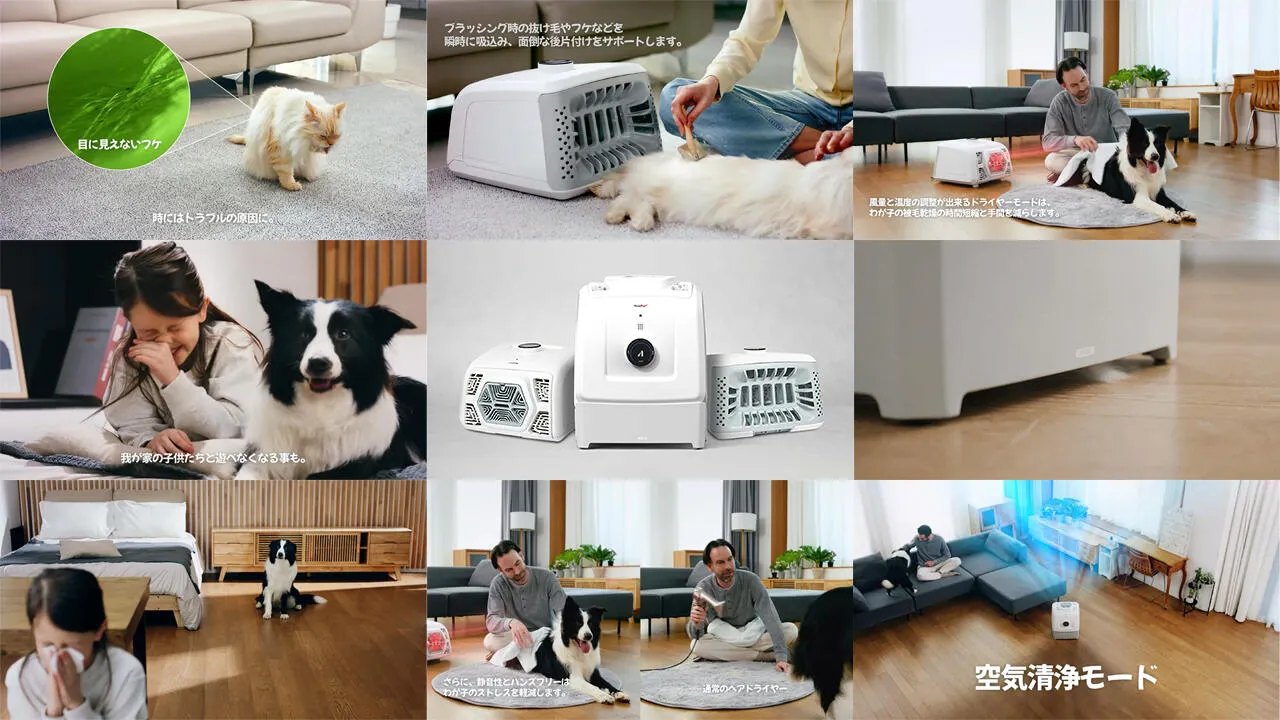 わんちゃん、ねこちゃんがいるご家庭の必需品である「毛の吸引ツール」、「ドライヤー」、「空気清浄機」を一台にした今までありそうでなかった新概念デバイスです。