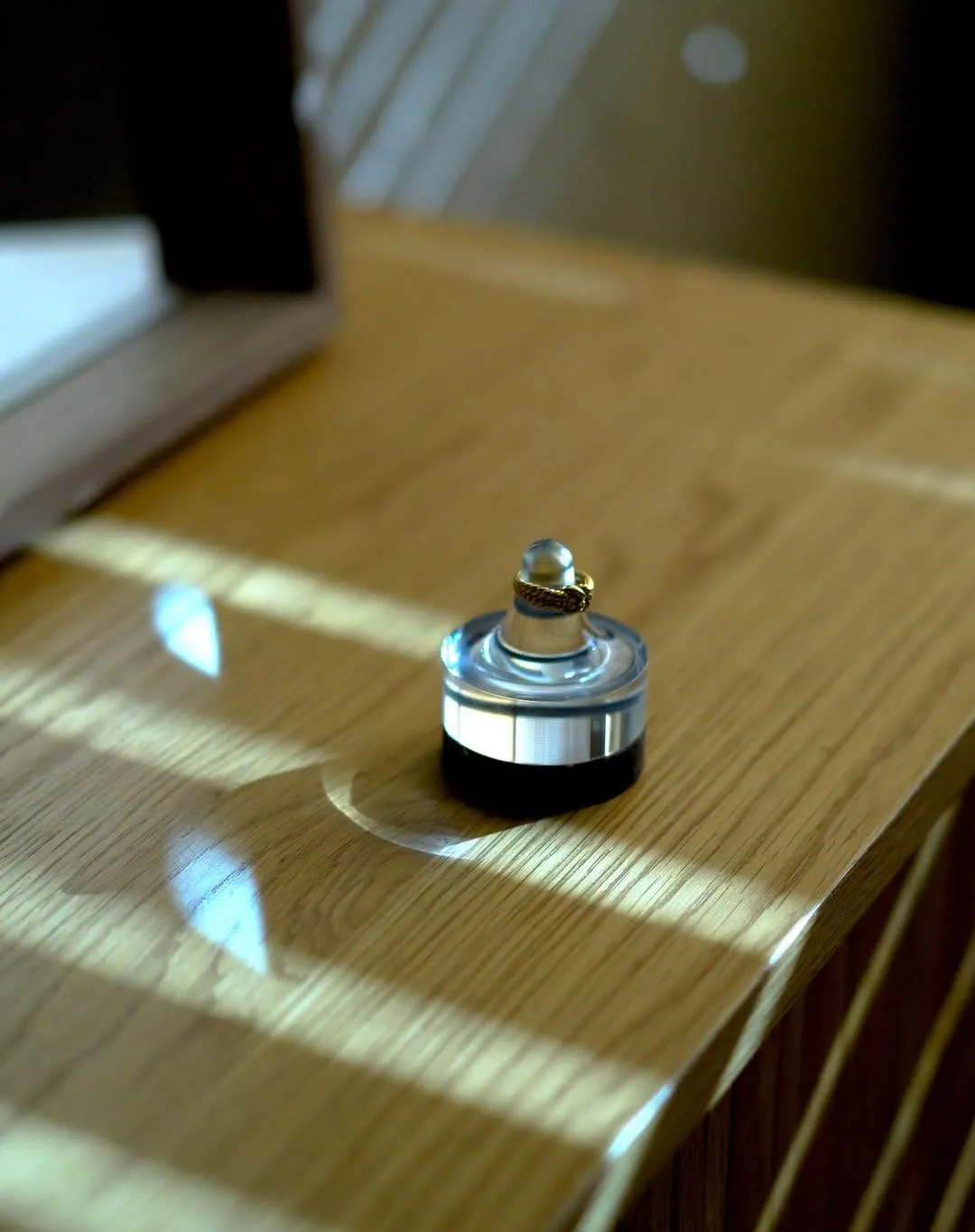 メガネを美しく魅せるためのスタンドです。直径50mm、高さ59mmのコンパクトなサイズながら、100gの重量が安定感をもたらします。透明なアクリルの先端が、どんなデザインのメガネも優雅に支え、大切なアイテムをインテリアの一部として昇華させます。実は指輪を飾るディスプレイとしても活用できる、多機能性も魅力です。