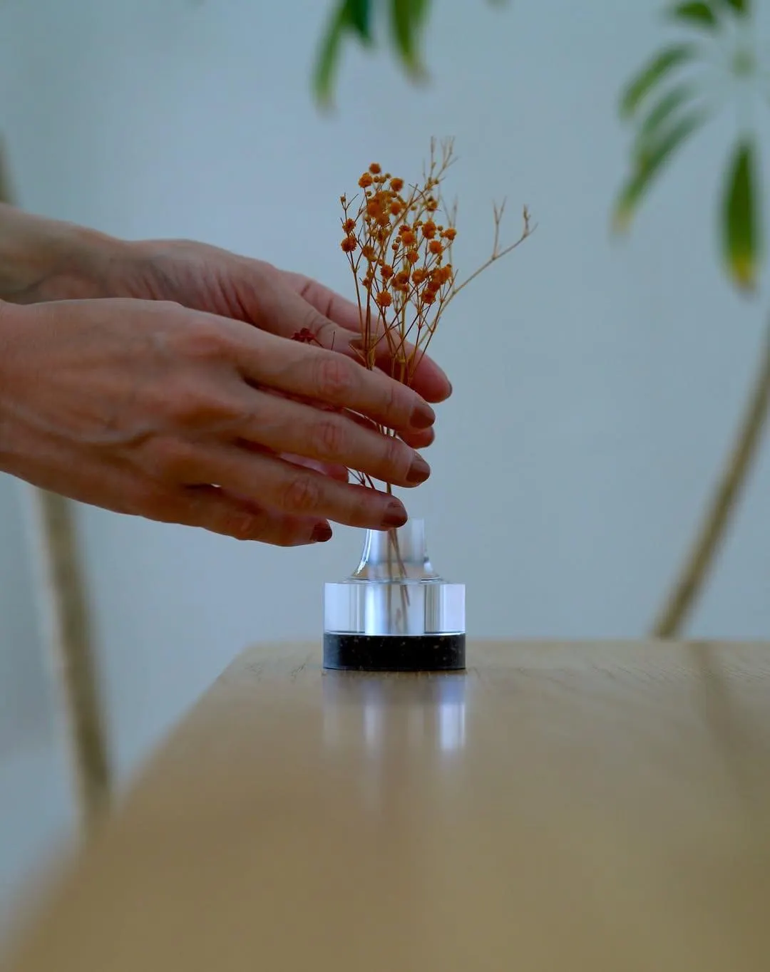 ディフューザーとして、または一輪挿しとして活用できる多機能プロダクトです。人工大理石の中央にあるくぼみにアロマオイルを数滴落とすことで、穏やかな香りが空間に広がります。また、一輪の花を挿せば、シンプルながらも存在感のあるフラワーベースに変身します。