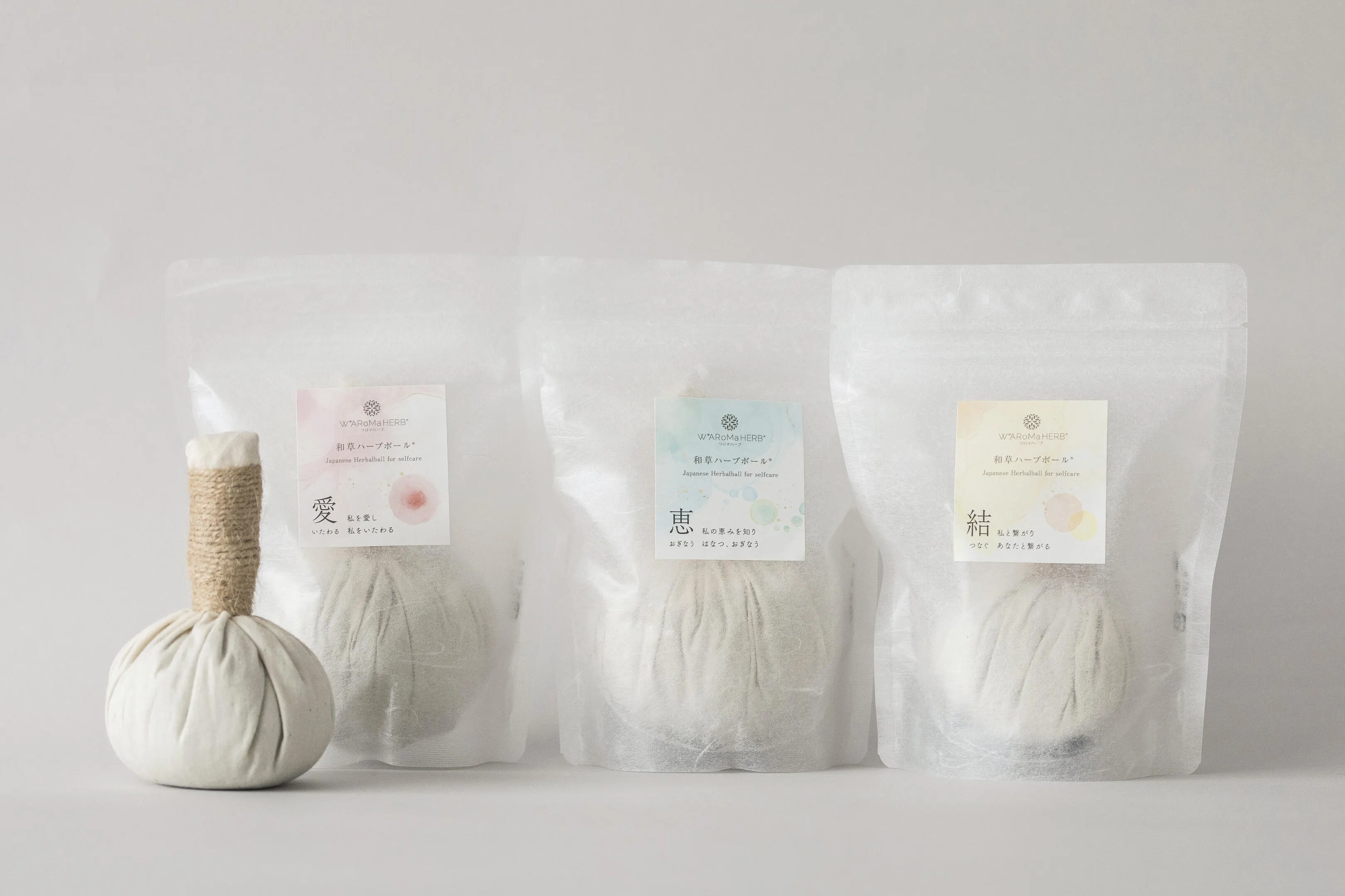 和草ハーブボールは、アジアの伝統療法を日本人のためにカスタマイズしたオリジナルハーブボールです。穏やかなハーブの香りと温かさ、そして優しく包み込む柔らかさが特徴です。日本全国各地のハーブが集結した唯一無二のセルフケアアイテムです。全3種(愛-いたわる、恵-おぎなう、結-つなぐ)