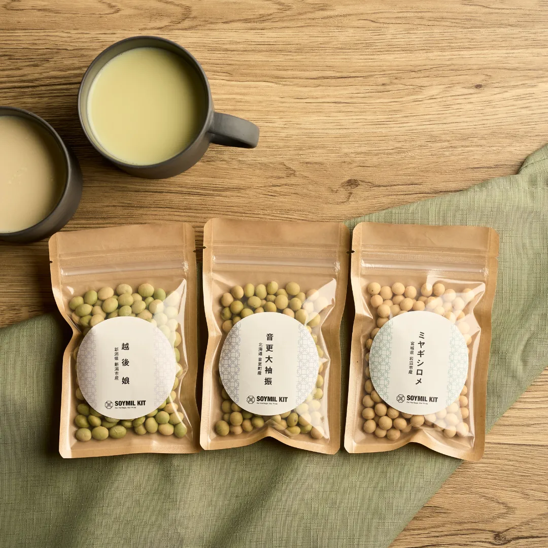 SOYMILの製品は、自然素材やサステナビリティへのこだわりが随所に息づいています。主力商品である「SOYMIL KIT」は、日本各地の希少な国産大豆を厳選し、無添加で豆乳を作れる点が最大の特徴です。豆乳キットと水をSOYMILブレンダーに入れてボタンを押すだけで、約30分後には出来立ての豆乳が完成します。