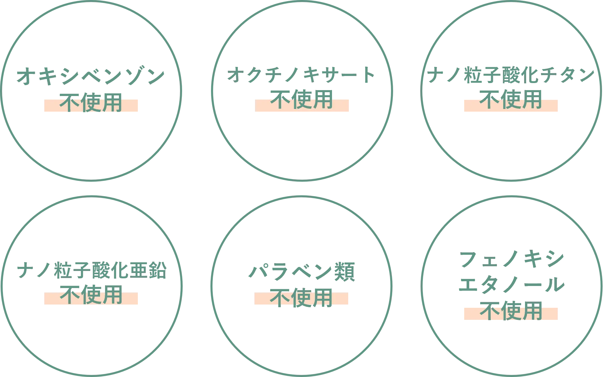 オキシベンゾン、オクチノキサート、パラベン類、フェノキシエタノール 等、ナノ粒子酸化亜鉛、ナノ粒子酸化チタン不使用。