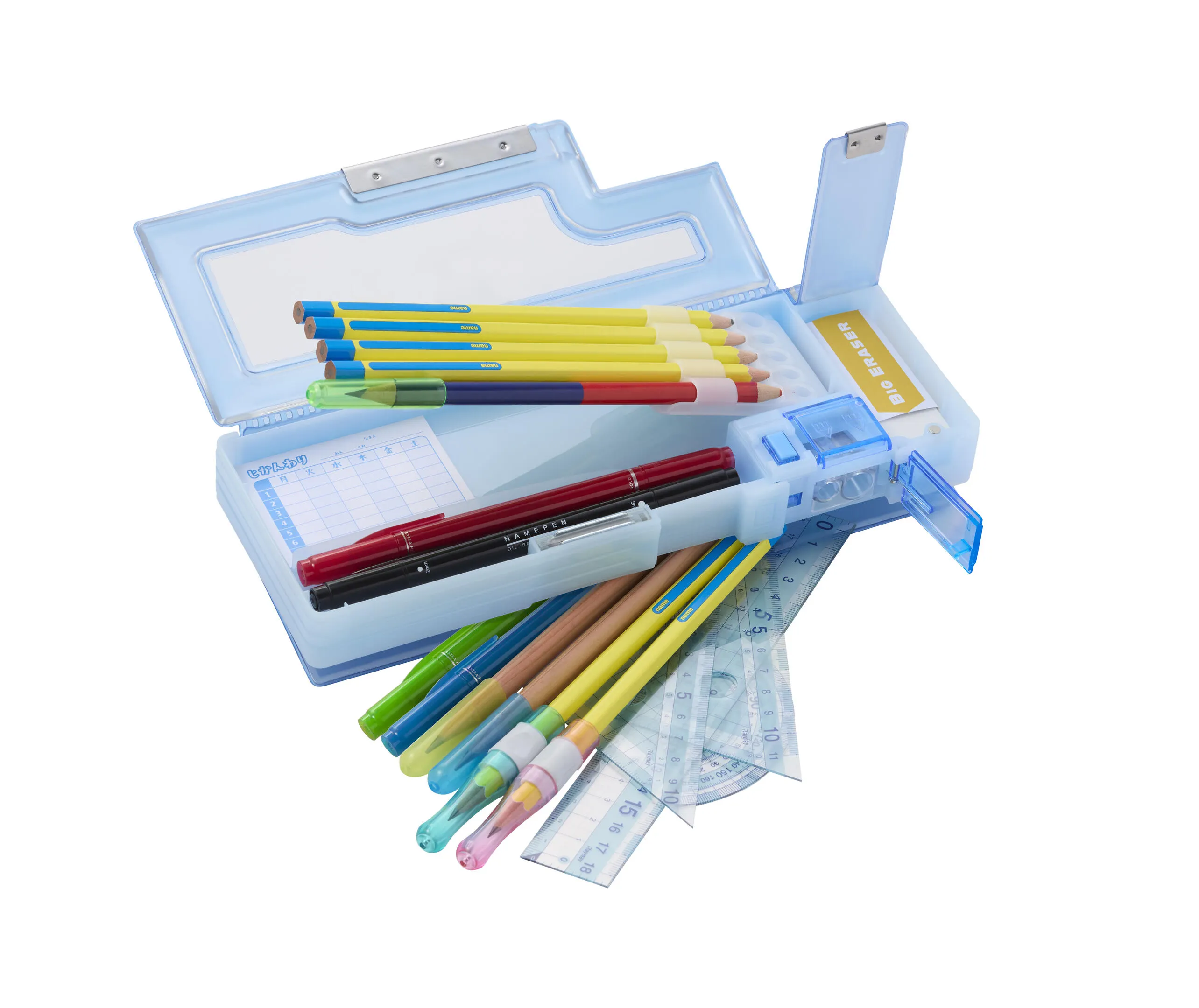 まず「3ポケット筆入 キャパレット」は、仕切りが3つに分かれており、鉛筆や消しゴム、定規などをすっきり整理できます。中身が見やすく、取り出しやすい設計で、片付けが苦手なお子さまでも自然と整理整頓の習慣が身につきます。削り器はスイッチで開くギミック式となっており、毎日使うのが楽しみになる筆箱です。
