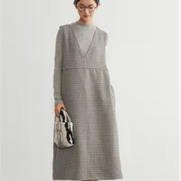 KNGT624・小紋柄風ジャカード織りVネックジャンパースカートポケット付き GRAY-M