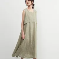KNXO522・ジャガードシフォン・レイヤード風フレアワンピース・2枚仕立て風ドレス・ノースリーブワンピース・裏地付き 8月中旬入荷GREEN/FREE