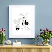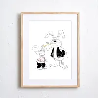 【現代アートポスター】アメリカンポップ コミカル モノトーン うさぎ 子ども ピザ イラスト A4(S) フレームセット:無垢 30.4×39.4cm