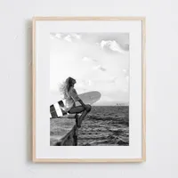 【現代アートポスター】サーフィンガール 海 波 モノトーン A4(S) フレームセット:無垢 30.4×39.4cm