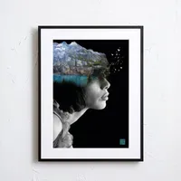 【現代アートポスター】 風景景色 女性 鳥 自然 神秘的 写真コラージュ A4(S) フレームセット:黒 29.4×38.4cm