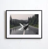 【現代アートポスター】 鯨 クジラ 海 動物 モノトーン モノクロ 道路 写真コラージュ A4(S) フレームセット:黒 29.4×38.4cm