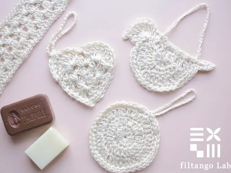 イベントでの1番人気は背中も洗えるロングタイプ。贈り物にはバード型、若い女性にはハート型が人気です。長年、産業に関わってきた地域の高齢女性たちの手編みで、絹糸への想いが込められたアイテムです。