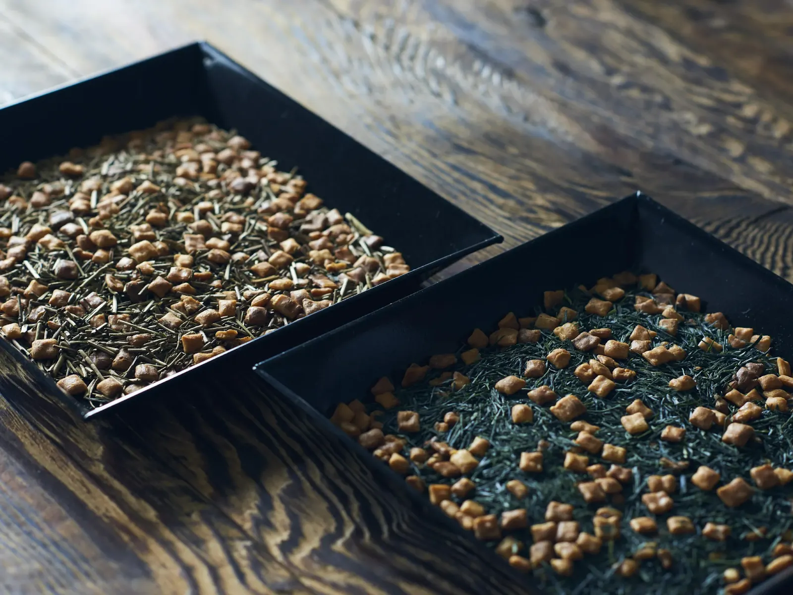 玄米茶の発祥は昭和初期、ある茶商が鏡餅を割って、できた細かいかけらを炒って茶葉に混ぜたことがはじまりといわれています。現在の一般的な玄米茶に使われているのは炒り米ですが、上ル入ルは原点であるお餅にこだわり、京都の老舗米菓舗「鳴海屋」の備長炭炭火炒り餅を使用しています。お茶の風味に寄り添いながら、炒り餅の香ばしさが鮮やかに引き立つ、玄米茶のニュースタンダードです。