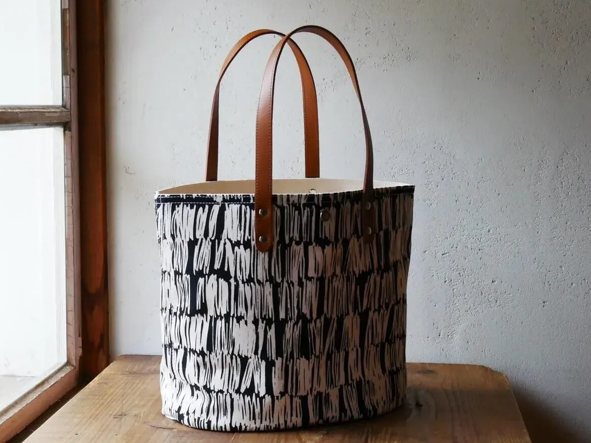 「線画プリントトートバッグ」は、京都の図案家集団GARAGELAND(ガレージランド)とのコラボで生まれたシリーズ。厚みのある耐久性の高い生地に温かみのあるモノトーンの手描き柄を型染め(スクリーンプリント)しています。内側にも帆布生地を使った2重仕立てで、持ち手のレザーも握った時にザラザラしないよう、2枚の皮を表側に縫い合わせてあります。