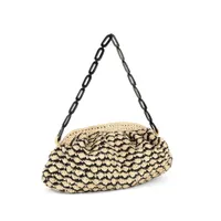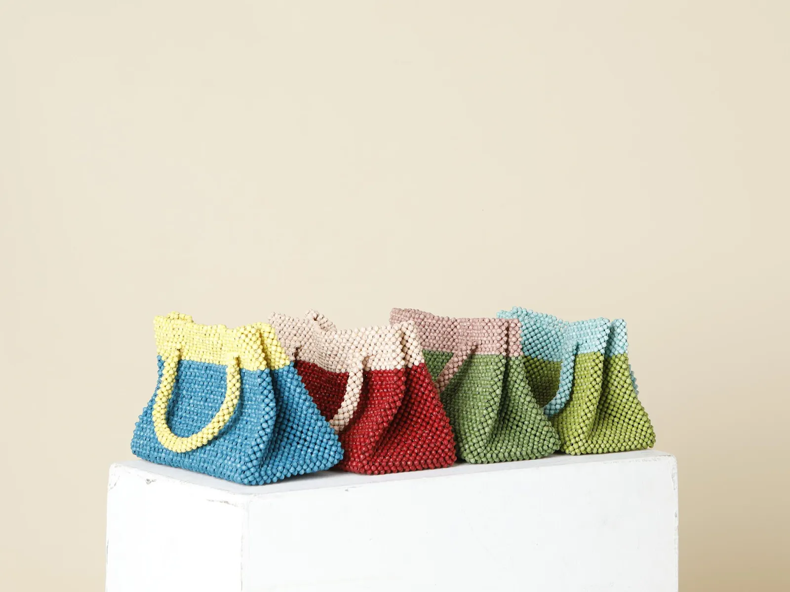 春夏におすすめなのが、カラフルなペーパービーズバッグ。使用されているビーズはプラスチックではなく紙。紙を一つひとつ小さく切って丸めてビーズにし、約2,000個を繋ぎ合わせてできたのがこちらのバッグ。一週間かけて1つのバッグを作っています。見た目以上に素材がしっかりしているので、コンパクトながらもしっかりと荷物を収納できます。