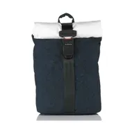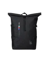 ミニマルでスタイリッシュなデザインが目を引くロールトップバックパックは男性に人気。