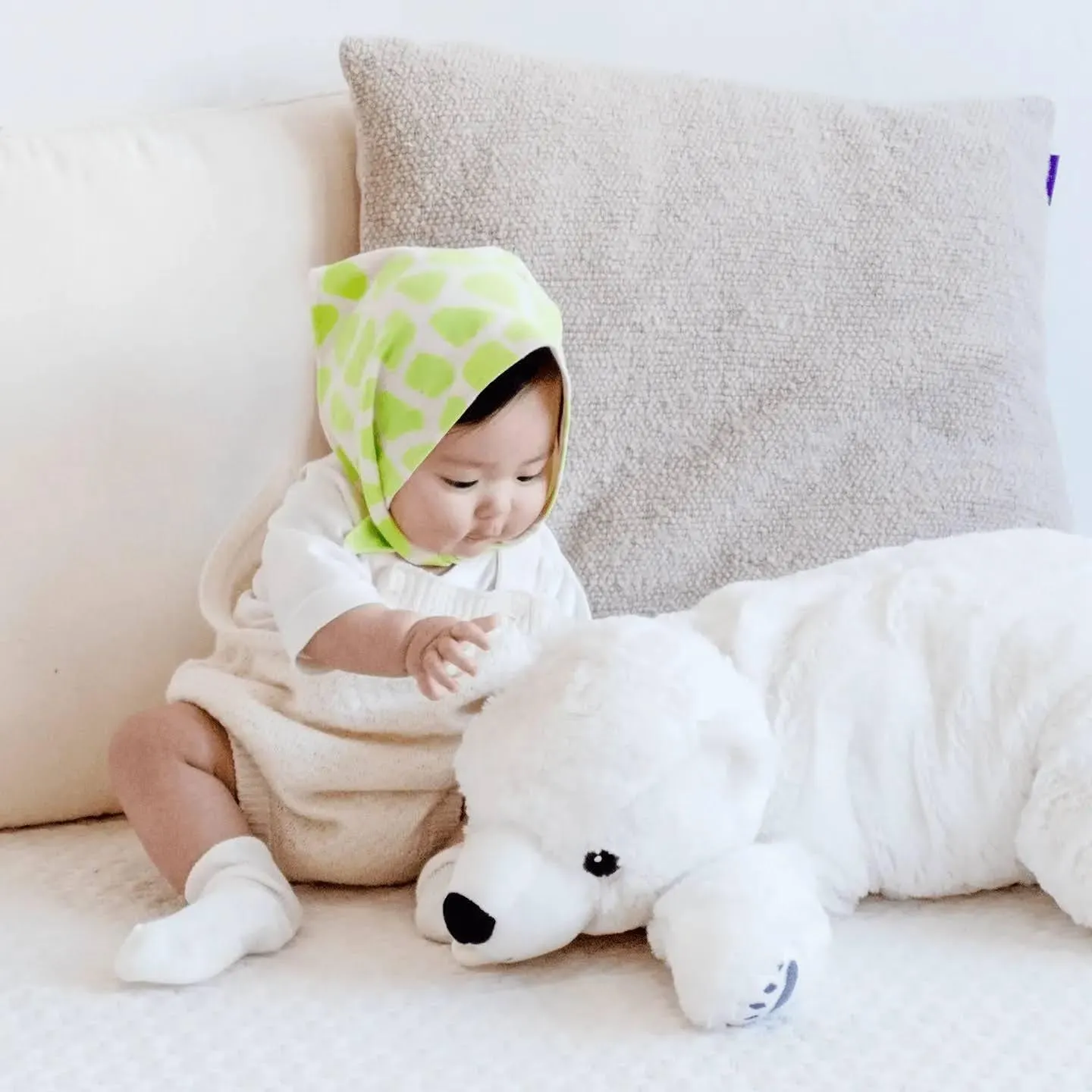 minima arca(ミニマアルカ)のキリン柄のスカーフビブは、色々な使い方で楽しめるマルチスカーフです。スタイとしてはもちろん、バンダナ風に巻いたり、頭に巻いてバブーシュカとしてファッションのポイントに。また、バッグに結んだりシュシュとして髪に結んだりと、ママとお子さんでリンクコーデも楽しめます。