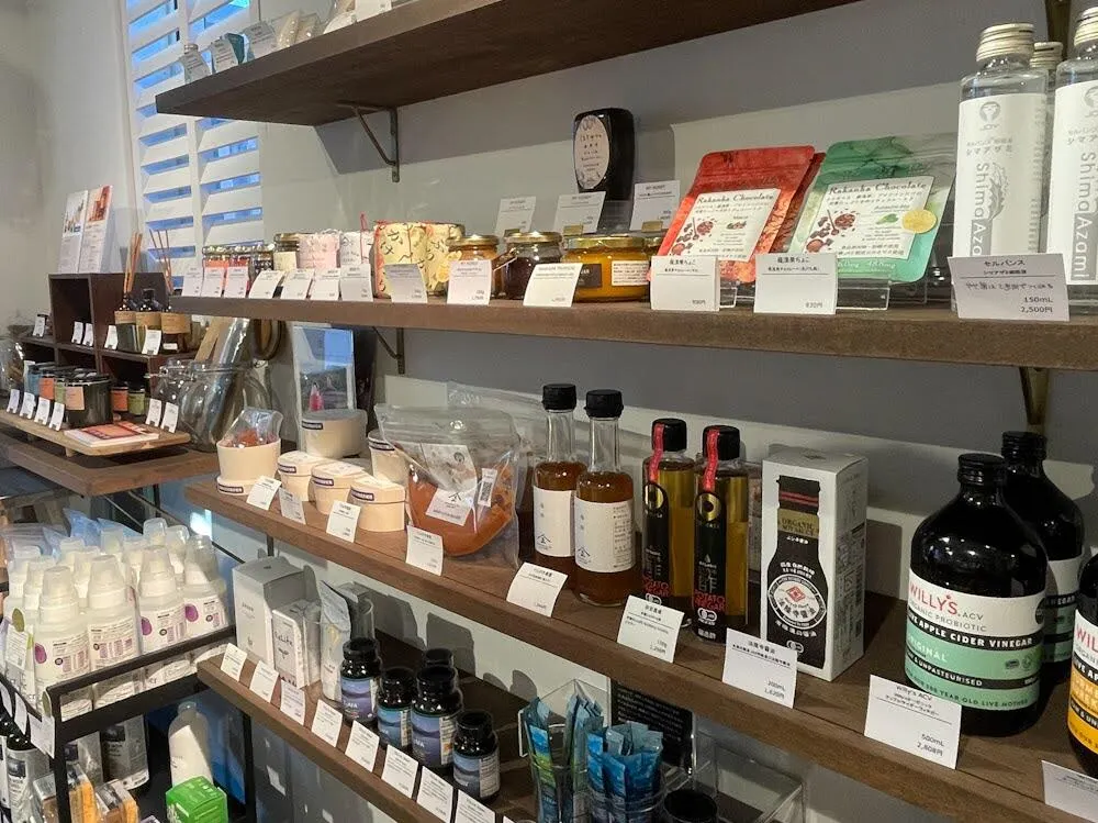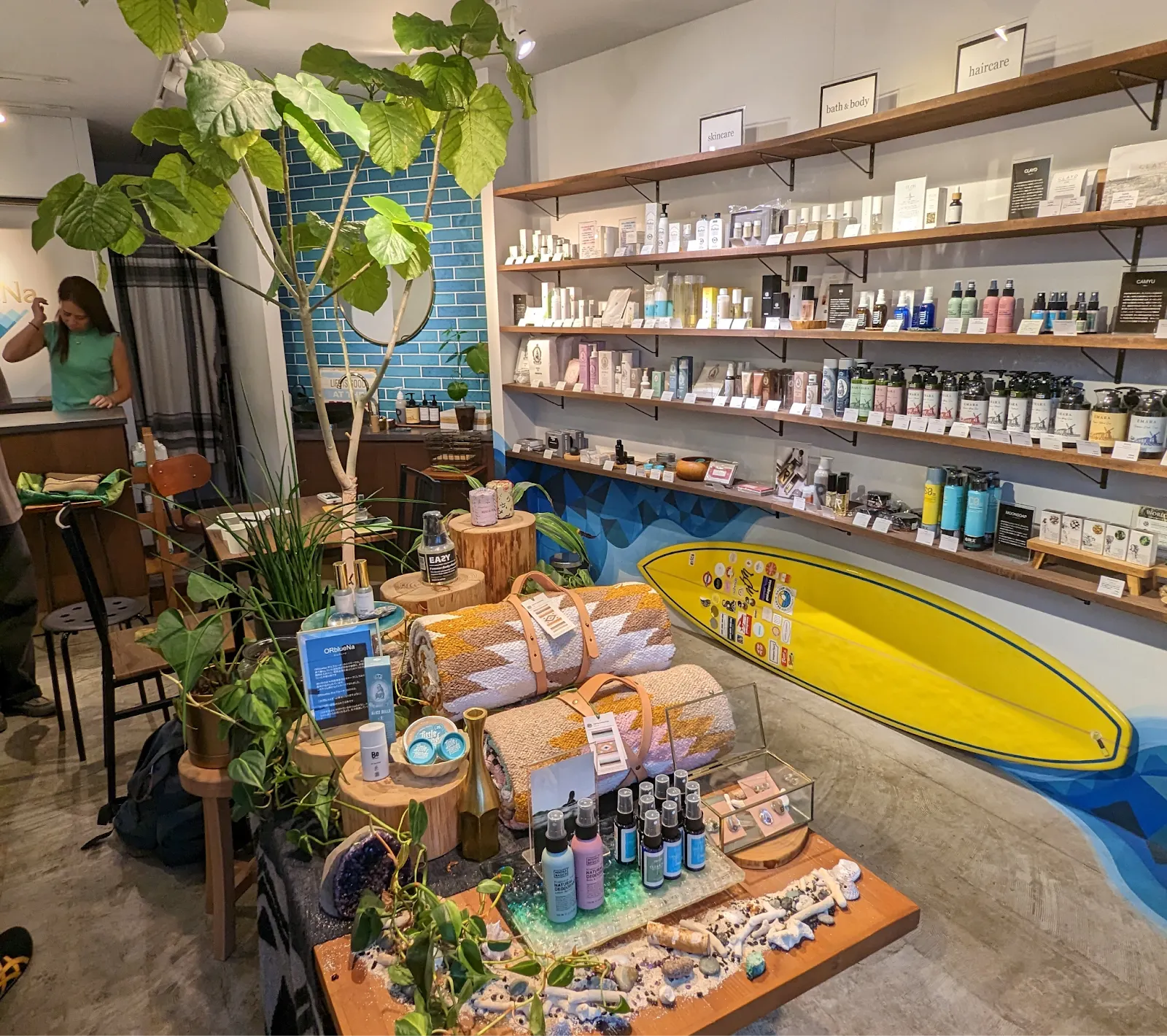 お店のテーマは「ごきげん」。サーフボードが置かれたフレンドリーな雰囲気の店内には、オーガニックでサステナブルな日用品やコスメ、インナーケアアイテムなど『こころとからだをご機嫌にすることで、じぶんや地球をご機嫌』をコンセプトに早坂さんが選んだ商品がディスプレイされています。