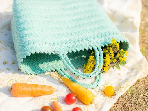 PPバンドという、プラスチックの包装資材を使って編まれているので軽くて丈夫。