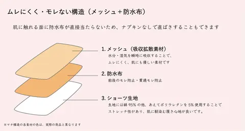 The gusset has water absorption and can cope with sudden menstruation when you are not wearing a napkin. Prevents seepage into the outerwear. It is reassuring to be able to prepare for sudden menstruation at a time when the menstrual cycle is not yet stable.