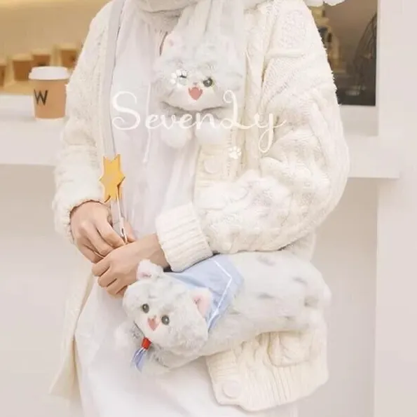 "Autumn and Winter New Release" MEWJI Original Silver Cat Fluffy Shoulder Bag Body Bag Cold Protection Bag 3-piece set
