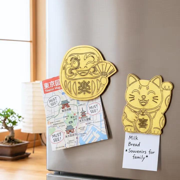 A wooden magnet with the motif of a beckoning cat and a dharma to express joy, anger, sorrow, and sorrow.