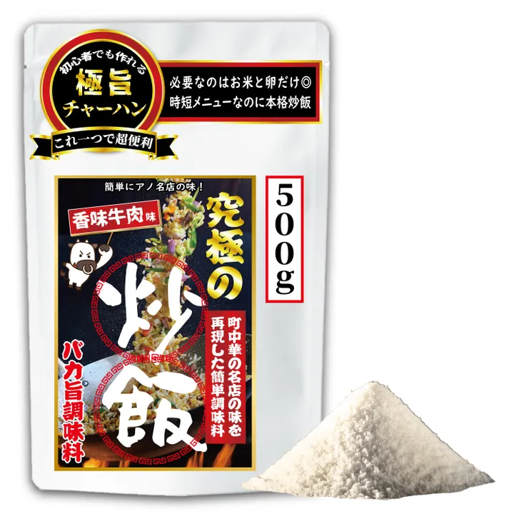 ●[The flavor of the beef is the main character. Just stir-fry it for authentic fried rice ◎] The golden ratio of rich beef extract × spices was developed in pursuit of the taste that goes best with fried rice. The fragrant stir-fry aroma and rich umami spread out with just rice and eggs, making it look like a town Chinese restaurant. This product is recommended not only for fried rice lovers, but also for beginners in cooking and those looking for time savings. ●[Time-saving menu, but no feeling of cutting corners◎] You can make authentic fried rice quickly with just cold rice and eggs, so you can rest assured even on busy days. No knife or special ingredients are required, and you don't have to worry about seasoning. It is a seasoning that can achieve "proper deliciousness" even in a short time. ●[Even if you are not good at cooking, the taste is determined ◎] Anyone can make a mistake just by stir-frying and the seasoning is perfectly determined. All you need is a frying pan. It is also perfect for cooking beginners and those who live alone. ●[Ingredients are minimal, but still satisfying◎] The flavor of the beef is strong, so it's satisfying enough to eat without meat or vegetables. It achieves deliciousness that does not compromise even on days when there are few ingredients. The refrigerator will play an active role as a "savior" on lonely days. Of course, you can also add ingredients such as "green onions", "meat", and "fish cakes" if you like. ●[Seasonings you want to stock at home] Seasonings that can be stored at room temperature and can be relied upon in an emergency ◎ It is easy to use because it can quickly respond to sudden visitors and late-night snacks. It is lighter, more space-saving and more versatile than frozen food. ●[A taste that will satisfy both children and adults◎] It's not too strong and delicious. The addictive seasoning is popular with the whole family. It is a versatile seasoning that is perfect for lunch boxes and holiday lunches, and is loved by people of all ages. ●【Environmentally Friendly Biomass Material Packaging】The product packaging of this product is made of environmentally friendly biomass material. By using plant-based raw materials, we contribute to the reduction of plastic and realize sustainable initiatives to protect the global environment. Product Description ●[The flavor of the beef is the main character. Just stir-fry it for authentic fried rice ◎] The golden ratio of rich beef extract × spices was developed in pursuit of the taste that goes best with fried rice. The fragrant stir-fry aroma and rich umami spread out with just rice and eggs, making it look like a town Chinese restaurant. This product is recommended not only for fried rice lovers, but also for beginners in cooking and those looking for time savings. Ingredients Salt (domestically produced), garlic, beef extract, spices (onion, black pepper), protein hydrolysate, soy sauce/seasoning (amino acids, etc.)