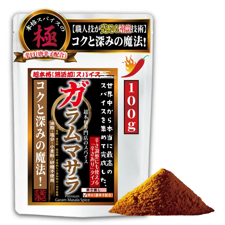 ●[King's Banquet Spice "Garam Masala"] Unlike curry powder, garam masala does not contain turmeric, which is the source of the yellow color of curry. ●[What is the difference between garam masala and curry powder and curry spices?] This is a base (basic) spice based on curry spices and curry powder. Garam masala is a "aroma and umami enhancement spice" for finishing, mainly used to finish dishes. ●[Add umami and aroma to your everyday dishes◎] Garam masala is a versatile spice made by blending multiple spices, and just by adding it to your dishes, you can create an authentic spicy first-grade, two-rank dish. ●[Luxurious use of Boot Jolokia & Carolina Reaper ◎] In 2007 & 2013, we generously blended Boot Jolokia and Carolina Reaper, which were registered as the world's hottest chili peppers, and developed a curry powder with overwhelming stimulation. ●[Additive-free, safe and secure◎] No additives such as flour, sweeteners, colorants, chemical seasonings, or preservatives are used. Therefore, you can enjoy the original deliciousness of spices. It also does not use salt, so it is recommended for those who are low-sodium. ●[Luxurious blend of the queen of very expensive spices "cardamom"! ] The sweet, refreshing, and elegant aroma will ultimately enhance the flavor of curry and ethnic dishes. It brings out an authentic richness and deep flavor that is not found in commercial products. ●[Recommended usage] It can be added to a small amount of curry rice made with commercial curry roux, a small amount added to retort curry, a little added to convenience store curry, or used to finish dry curry. It can be said to be an easy all-purpose seasoning for curry and ethnic dishes. If you want to use it to finish curry, add about 10 teaspoons for 3 to 4 servings just before turning off the heat, or after turning off the heat. It is a spice that is easy to adjust to your liking while eating. ●[You can choose from two types: non-spicy and dry (with Jolokia) ◎] The "no spiciness" type does not use chili peppers, so there is no spiciness. Therefore, it is a spice that adds only the perfect aroma and umami to those who don't like spicy tastes. The "Dry (Jolokia-in-Formulated)" type is a unique chili pepper blend that allows you to adjust the spiciness in addition to the aroma and umami of garam masala. If you add it to commercially available sweet curry or curry for children, it will quickly replace it with curry for adults. You can easily enjoy your favorite curry for each family. Reduce the number of impressions