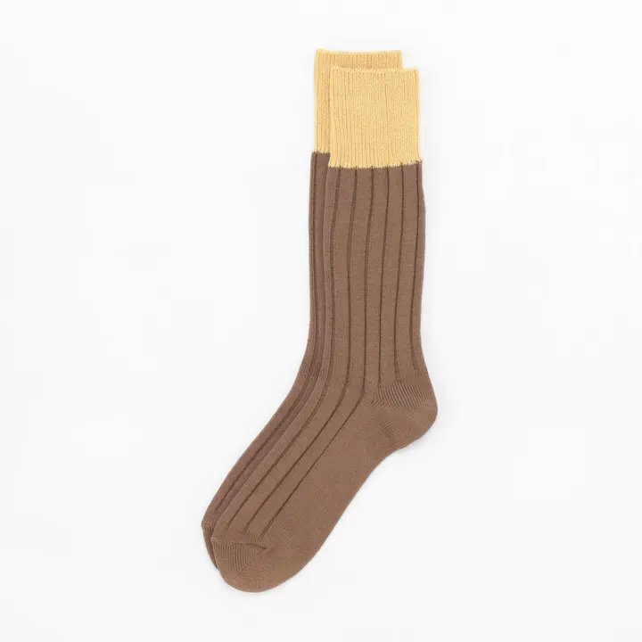 High Society Crew Socks. The glossy cotton is dyed in an original color and has a fun color scheme typical of HOiSUM. The bi-color design with different colors adds a subtle accent to your feet. The crew length is easy to incorporate into everyday use, making it easy to match with any style. Just by changing the length and color of your socks, the look on your feet will change drastically, so please try incorporating them into your daily outfit.