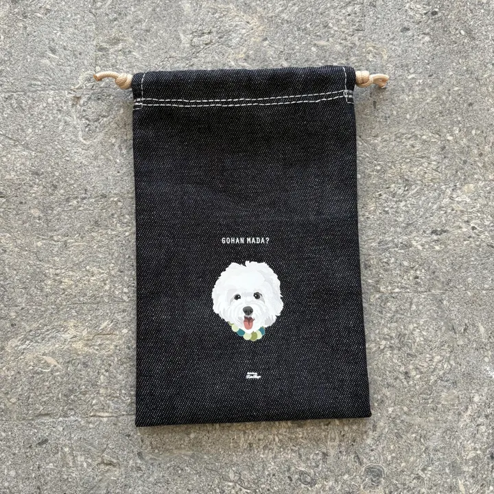 This is a drawstring bag with an original illustration. Since it is vertical, it can hold a smartphone and is a convenient size. It is also popular as a gift. The printed text is "GOHANMADA?" (Not yet?) ) 「ASOBO!」 (Oh, let's go!) ) Since it is a handmade product, there is some variation in size.