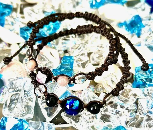 【海のカケラ】 ホタルガラスのペアブレスレットです。 メンズはブルーの8㎜のホタルガラス&6㎜のオニキス、クォーツ、銀色スペーサーを使用してます。 レディースは8㎜のホタルガラス&6㎜のローズクォーツ、クォーツ、銀色スペーサーを使用してます。 ブラウンのワックスコードで捻り結びで編み込みました。 サイズ調整はスライドで調整できます。 メンズは17cm〜フリーサイズ、レディースは15cm〜フリーサイズになります。 【天然石の意味】 オニキス 「成功」「厄除け」「夫婦の幸福」 ローズクォーツ 「真実の愛」「真実の美」「愛の告白」「美と健康」 クォーツ 「純粋」「無垢」「神秘的」「冷静沈着」 ※サイズはあくまで目安です。ハンドメイドなので若干の誤差が御座いますことをご了承ください。