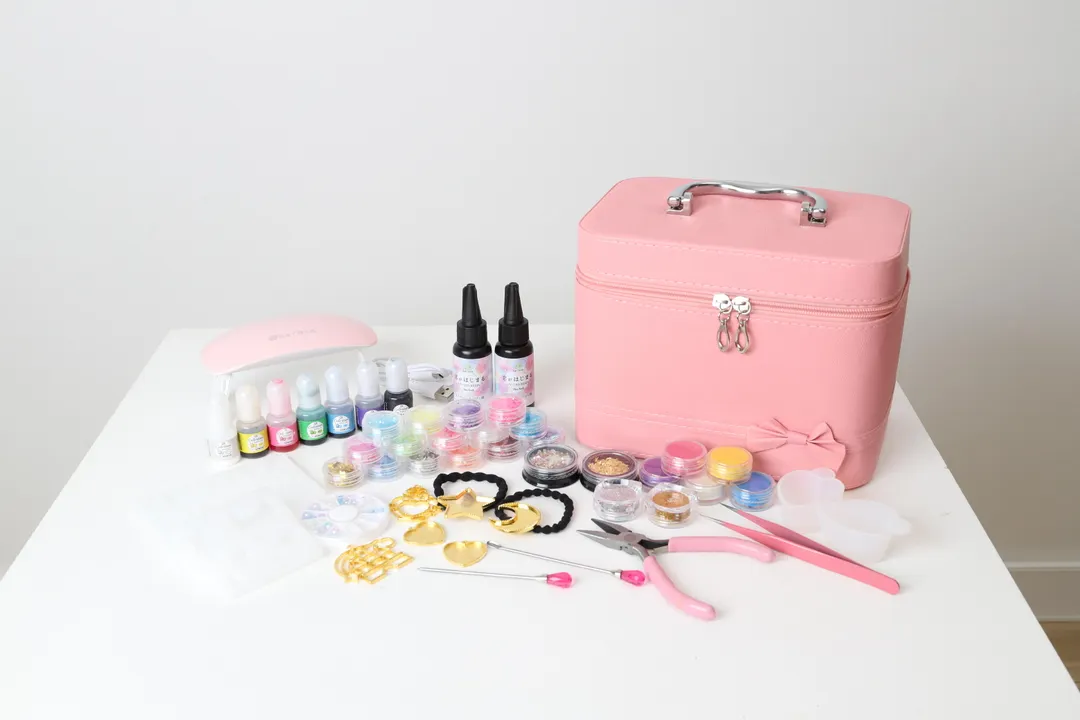 『親子でレジンクラフトをやってみたい!』 『だけど、難しそうだし道具を揃えるのも大変そう…』 ケラッタのドリーミーセットは、お子様も初めての方も、楽しく簡単にレジンアクセサリーが作れます♪ 必要な道具が全て揃っているので、届いたその日にアクセサリー作りを楽しめちゃいます! レジンクラフトの基本から上手に作るコツなど記載した"ガイドブック"も付いているので、初めてでも安心♪ ネックレス2個、キーホルダー2個、デコレーションミラー1個、ヘアゴム2個の全部で7個のアクセサリーが作れるので 親子で自分好みのアクセサリーを作ってオシャレを楽しめちゃいます♪ ★アクセサリーパーツ17点★全部で7個のアクセサリーが作れるアクセパーツ付き!デコレーションミラー1個に、ネックレス2個、ヘアゴム2個、キーホルダー2個が入っているので親子でお揃いにしても◎です♪ ★キラキラ素材31点★ときめくのは子供だけじゃない!大人も心おどる、キラキラかわいい素材が31点も入っています♪ ★必須道具29点★レジンクラフトに欠かせない道具が29点も入っているので、届いたその日に始められます! ★レジンクラフトが初めてのお子様も大人も安心して楽しめるビギナーズガイドブック付き! ★お片付けも楽しい?!内側がカワイイ花柄の専用ボックス付き♪ 【収納ボックス】セット品を収納できるピンクの専用ボックス付きで、お片付けもラクラク! 【カラーパウダー】レジン液にまぜるだけで、自分好みのカラーレジン液が作れます♪5色セットなので色同士を混ぜれば5色以上のカラーレジン液を作ることが可能です♪ 【LEDライト】硬化の早いLEDライト付き!とってもコンパクトなので、持ち運びにもとっても便利です♪ タイマー機能付きなので、作業もスムーズ!45秒、60秒と使い分けることが可能です。USBケーブル仕様なので、スマホ用のアダプターがあれば使えちゃいます♪※本製品にはUSBケーブル用のACアダプターは付属していません。 【ガイドブック付き】レジンクラフトが初めてでも大丈夫!大人も子供も基本から学べるガイドブック付き! モールドってどうやって使うの?空枠ってなぁに?ミール皿ってなぁに? レジンクラフトのあれこれがこれ一冊で分かる、初心者でも安心のガイドブックです♪ 基本的な事だけでなく、上手にしあげるコツなど様々な情報が満載♪
