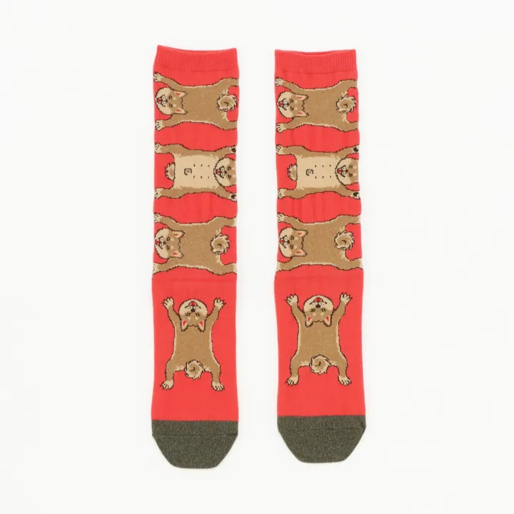 コーヒーショップで出会った、愛しい犬たち。 大阪のコーヒーショップ「EK COFFEE」。そこに集う犬たちの愛らしい表情からインスピレーションを得て生まれた、特別な一足です。 日々コーヒーショップに訪れる飼い主さんと犬たちとの温かな時間。そんな日常の一コマを切り取り、靴下に落とし込みました。 モデルは、もうすぐ4歳になる豆柴の「ごはん」君。人懐っこくお散歩が大好きで、家には20個以上ものボールがあるほどの遊び好き。 そんなごはん君の凛とした佇まいを、優しいオレンジとブラックで表現。温かみのある色合いが、どんなスタイルにも馴染みます。