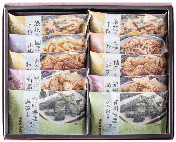 原材料の餅米は国産米100% 杵つき、せいろ蒸しなど昔ながらの製法にこだわっています。 多彩で奥深い味わいを6種類ご用意いたしました。 ■【梅ざらめ】和歌山産南高梅をふんだんに使い、うす口醤油のあられにザラ目砂糖をふりかけています。 ■【山椒柿の種】国産山椒を使った、柿の種。爽やかな香りと優しい辛さの柿の種です。 ■【醤油おかき】大阪法善寺あられの自慢の品。四角い薄型の甘口醤油あられに国産の海苔を散らしています。 ■【七味あられ】やさしい辛さの七味で仕上げた、小枝のようなあられです。七味の辛さがお口の中で後をひきます。 ■【磯辺】佐賀県有明産の焼き海苔を贅沢に使いました。薄く焼いたあられが、海苔の香を際立たせます。 ■【柚子おかき】天然柚子を使って、うまみを逃さず閉じ込め、柚子の風味がお口に広がります。