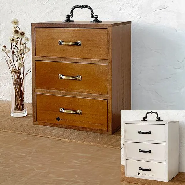 北海道 旭川市の自社工場で製作しています 大人気のミニチェストに持ち手が付きました。 一番下の引き出しだけにワンポイント入った柄も大人っぽくて◎。 救急箱としてだけでなく、文具や手芸用品などのお道具箱としても使い勝手が良いサイズ。 ■商品サイズ 本体外寸   約 横幅188×奥行140×高さ235mm 引き出し内寸 約 横幅150×奥行100×高さ56mm  (板の厚みなどで、多少の誤差が出る場合があります) ■材質 桐と合板を使用。木目、色合いなどが1つ1つ違います。