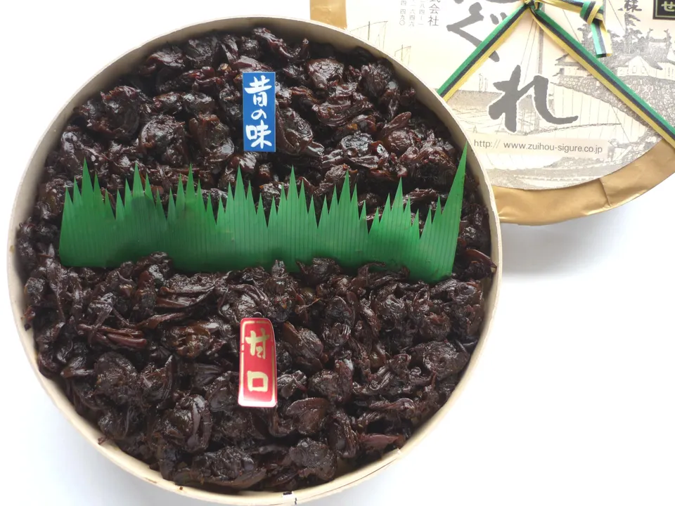 創業昭和50年の志ぐれ屋 瑞宝志ぐれ  瑞宝志ぐれは創業当時から『手づくり』にこだわり続けております。 創業時から研究と試行錯誤をくりかえし、たどり着いた門外不出の秘伝の味を、生のたまりにくわえてできた『瑞宝特製たまり』は独特の味わい深さが特徴です。 その特製たまりに素材を漬けこみ、約70℃の熱に耐えながら一釜一釜直火で炊き上げることで、手仕事ならではの繊細で愛情のこもった志ぐれ煮が仕上がります。 瑞宝特製たまりで炊き上げると・・・さっぱりとした甘味と、たまり本来の辛みが絶妙に絡みあい、なんとも味わい深く、他にはないふっくら感が、瑞宝志ぐれの特徴です。 炊きあがった志ぐれ煮はしっかり味を染みこませるため一日寝かし、選別も『ひとつぶ、ひとつぶ』人の目で確認しながら行っています。たいへん手間もかかり効率も悪いのですが、日本一になるために、手作業にこだわり続けて仕上げた『瑞宝志ぐれ』をぜひご賞味ください。 昔ながらの辛口味と甘口味の2種類入りです。