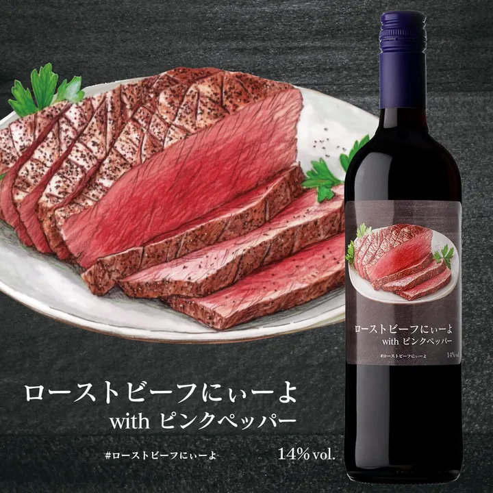 【ローストビーフにはやっぱり赤ワイン!旨さ引き出す究極マリアージュ、発見。】 肉の旨みあふれるローストビーフはパーティの主役になれる一品です。だからこそ、最高の赤ワインと合わせたいものです。 そんなとき絶対におすすめなのがこの「ローストビーフにぃーよ with ピンクペッパー」。 ワインがお肉の旨みをさらに引き出して、大満足いただけること間違いありません。 【大人気の田邉公一ソムリエ監修相性の決め手は「ピンクペッパー」】 このワインとフードのペアリングを監修してくれたのが大人気の田邉公一ソムリエ。 田邉ソムリエいわく、ローストビーフにピンクペッパーを添えることで、相性が格段にアップするとのことです。ピンクペッパーならではの華やかなスパイシーさが、ワインの持つスパイシーさと絡み合い、お肉のポテンシャルを最大限に引き出してくれます! 【果実味あふれる芳醇赤ワイン大きめのグラスに注ぐのがコツ!】 ベリー系の豊かな香りが魅力のワインは、ぜひ大きめのグラスに注いでみて! まずはワインの香りを楽しみ、次にローストビーフを一口。食べ終わったタイミングでワインを一口。この流れは、想像するだけでたまらない体験です。 飲む際は、ほんの少し冷やす程度にしておくと、香りと味わいのバランスがより良く保たれます。 ◎おススメの飲み方 名前の通り、ポイントはピンクペッパーと合わせること。ピンクペッパーの華やかな香りが加わることで、ワインの持つ豊かな風味がより感じやすくなります。ぜひ大きめのグラスを用意して、あまり冷やさず華やかな香りをお楽しみください。