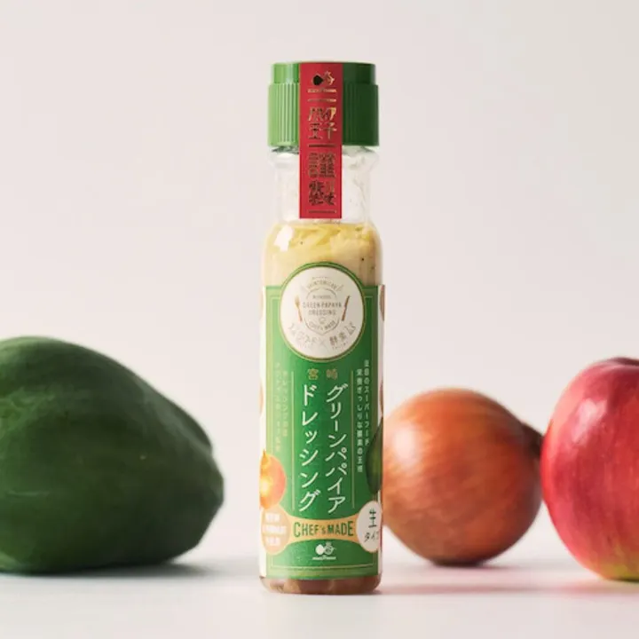 【宮崎・九州山口各県内のメディアに登場!】 【2022年の注目スーパーフードとして雑誌にも商品掲載!】 【リピート率ナンバーワンの商品です!】 〜パパイア王子謹製〜 リピーターが抜群に多いグリーンパパイア酵素ドレッシング 青パパイアが絶品ドレッシングとなって登場です。 宮崎県内で人気のドレッシングを展開するレストランのシェフ監修のドレッシングとなります。 果肉とすりおろし青パパイアがたっぷりと含まれており食べ応え抜群のドレッシングです。 野菜だけでなく肉や魚とも相性抜群です。様々なレシピに活用して頂けます。 また、通常のドレッシングよりも使用している油の割合が少なく、 カロリーも抑えたドレッシングとなります。 商品名:グリーンパパイア酵素ドレッシング 原材料名:食用植物油脂(キャノーラ油(国内製造)オリーブオイル)、青パパイア、玉ねぎ、うすくちしょうゆ、醸造酢、りんご、砂糖、食塩、生姜、ニンニク、黒こしょう(原材料の一部に小麦、大豆を含む) 内容量:900ml 賞味期限:枠外下部に記載 保存方法:開封前後にかかわらず要冷蔵