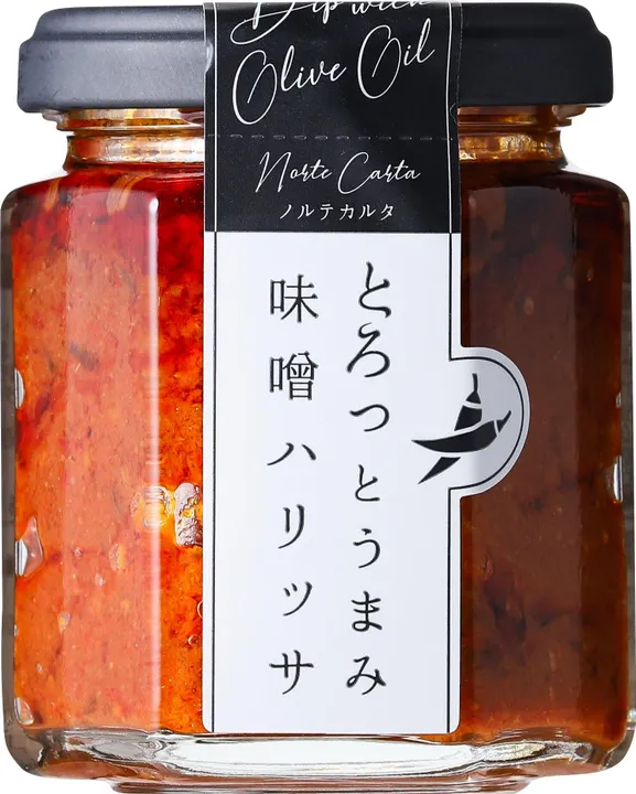 アレルゲン:大豆、ごま 栄養成分表示(1個あたり):エネルギー269kcal、たんぱく質6.8g、脂質17.0g、炭水化物22.1g、食塩相当量6.2g 【商品説明】 秋田県産味噌とトマトをベースに、しょっつるをきかせてうまみの際立つ地中海の調味料ハリッサ風に仕立てました。 唐辛子の香りに加え、食感が楽しい3種のホールスパイスが複雑で刺激的。 これひとつで味が決まる、新定番の調味料です。 ・ひき肉と合わせてタコスミートに ・サバ缶と混ぜてごはんのおともに ・生野菜につけてスパイシーモロキュウに ・ゆで豚に和えてポッサム風に