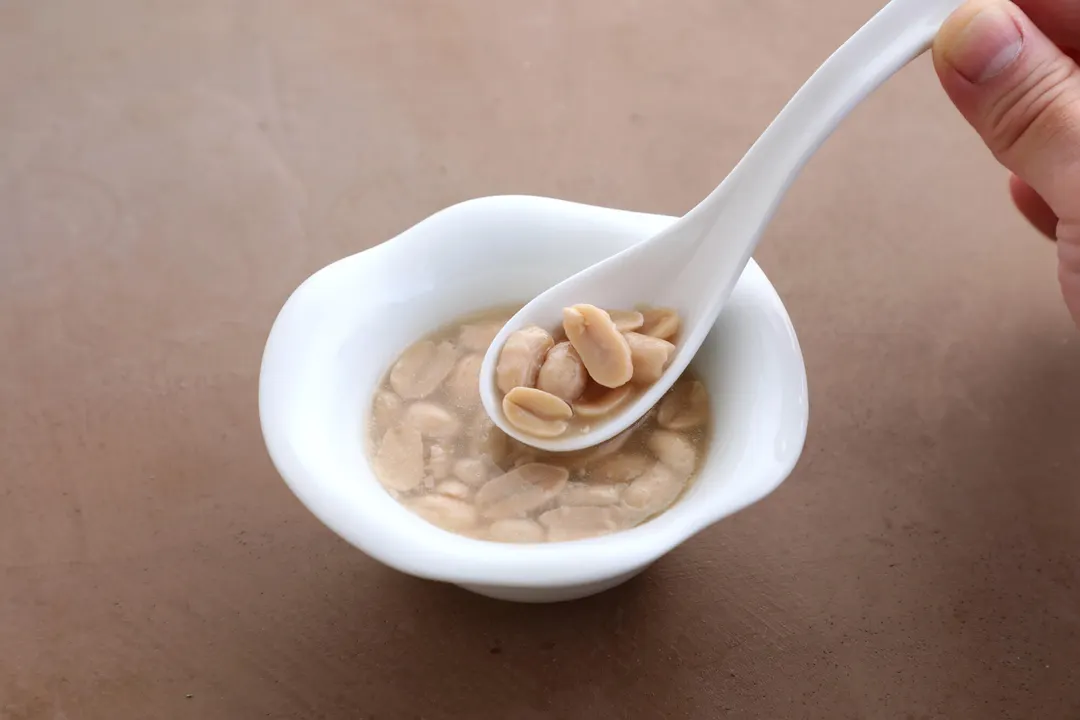 長生果といわれる落花生にまろやかなきび砂糖をあわせた福建・台湾でよく食べられる伝統的なおしるこです。 熱量 169kcal、たんぱく質 4.2g、脂質 11.0g、炭水化物13.4g、食塩相当量0.05g
