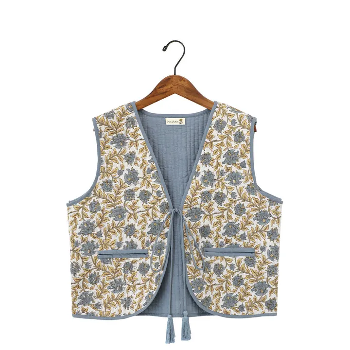 優しい花柄を差し色に 「カリーノ」は「かわいらしい」という意味。 短めの丈で軽く羽織れるベスト。 優しい印象の花柄がコーディネートの差し色になってくれます。 パイピングと同じ色のフリンジ付きのリボンがデザインのアクセントに。 シンプルなワンピースやシャツとのコーディネートもおすすめです。 「ブロックプリント」は木版を使って、職人がひと版ひと版、手でスタンプを押すように生地の上にプリントするインドの伝統的な技法です。 ※表示数量を超える在庫や、詳しい納期につきましてはメッセージよりお問い合わせください。