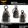 アメリカ製ガーディアンベル社製ガーディアンベルです。 MADE IN USA アメリカ製 交通安全 魔除け 御守り ガーディアンベル アメリカのライダーの間には、事故や、転倒の原因は「道路にひそむ悪魔」によるいたずらだという伝説があります。悪魔は走る者に悪戯やトラブルを運んできます。このベルは美しい音色で悪魔たちを追い払うと言われ愛されています。そんな悪魔のいたずらを防ぎ、御守りとなるのが、守護者のベルという意味を持つガーディアンベル。 日本でも鈴の音(ね)は神道では魔除けの音と言われています。ピューター製の鈴でいい音色でガーディアンベルはデザインも様々あります。 またガーディアンベルにまつわる伝説として、プレゼントとして送られたベルの効果は、自分で手に入れたものの2倍になると言われています。 それゆえに彼氏・彼女・友達・家族へのプレゼントとしての人気も非常に高まっています。 シルバーアクセサリーのようにおしゃれに装着できて素敵な音色を奏でるガーディアンベル。 バイカー以外にも自転車や旅・交通安全のお守りとしてお使いいただけます。 カバン・ランドセル・キーホルダー・ペットの首輪等に付けてお使いください!! ※タイラップ等でバイクのフレームにも簡単に取り付けできます。 アメリカンモデルだけではなく、旧車ファン、レプリカライダーまで、さらにバイクだけでなく、自転車や車にもピッタリな御守りとなっています。 アクセサリーとしても人気で、アイディア次第で車体だけでなく、キーホルダーや鞄など、どこにでも付けておしゃれに楽しめます。