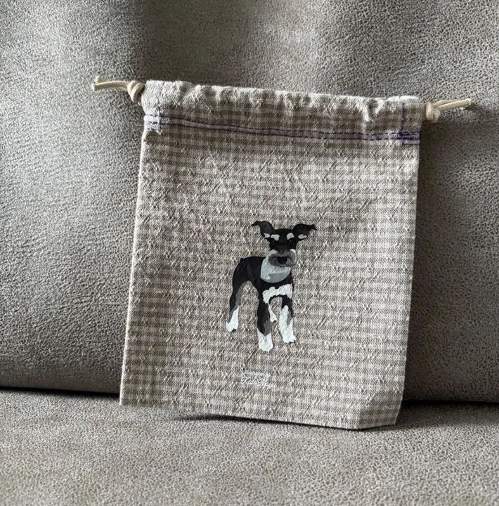 【Mサイズ 巾着 / 薄手生地】 オリジナルイラスト わんこ巾着 小さい巾着  プレゼントに◎ ミニチュアシュナウザー (約130mm × 110mm)