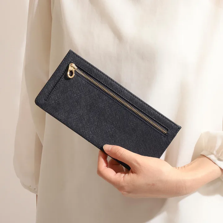 【薄さ × 収納力】 「最近流行りのミニバッグに収納できる薄さが欲しい」 「薄くて、しっかりお札や小銭も入る財布を探している」 そんなお声から、薄さと収納力を兼ね備えた薄型長財布を開発しました。薄さは業界最高峰の ”0.5cm” を実現。この薄さにもかかわらず、カード6枚、お札や小銭もたっぷり収納することができます。 週末のデートや1泊2日の旅行から、フォーマルシーンなどいろんな場面でお使い頂くことができます。 【使いやすい小銭ポケット】 薄型財布は「小銭ポケットがペタンコで取り出しにくい」というデメリットががありますが、本製品では「マチあり小銭ポケット」を取り付けました。 小銭ポケットの片側にマチを付けることで大きく開き、小銭の取り出しが楽にできます。 【素材にもこだわりを】 「お気に入りの財布を長くご愛用していただきたい。」 そんな想いから素材にもこだわりました。 数ある革の種類の中からキズや汚れに強い、本革を特殊加工したサフィアーノレザーを採用しました。表面に樹皮加工を施しているので、水や汚れもサッと拭くだけで簡単にお手入れすることができます。 忙しくて財布のお手入れをする時間が無い方でもキレイに保つことができます。 【スキミング防止機能付きでセキュリティも安心】 特殊な機械を使用し、知らない間にカードの情報を抜き取るという「スキミング」という犯罪が増えています。そんな悪質なスキミングの犯罪から、あなたの大切なカード情報を守るため、カードポケットにはスキミング防止機能を搭載しました。 カードポケットにカードを入れておくだけで、大切なカード情報を守る事ができます。自分の身は自分で守る時代、しっかり対策していきましょう。