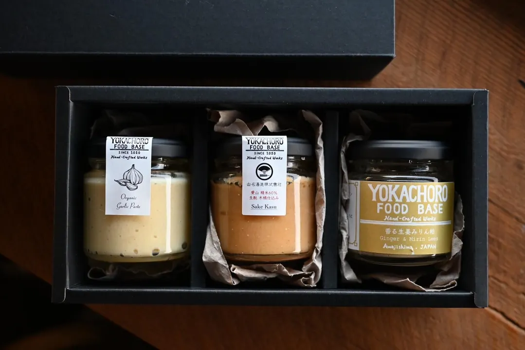 塩酒粕:酒粕(丹波市製造)、天日塩 芳香 生姜ペースト:みりん粕(愛知県製造)、生姜、天日塩、白ワインビネガー、みかんの皮 にんにく塩麹ペースト:にんにく(兵庫県丹波市産)、塩麹(米麹、天日塩)、オリーブオイル、天日塩、白ワインビネガー