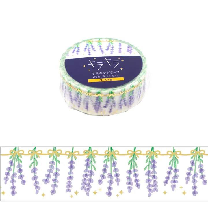 【 キラキラマスキングテープ 15mm Lavender】 ★★ 箔を使用した、キラキラが可愛いキラキラマスキングテープ 〜 第6弾 Garland、Garden、Candyの3つをテーマに <12柄> を揃えました ★★ ゴールド箔がちりばめられた、箔がキラキラ可愛いマスキングテープです。 伸ばして貼っても、切り取ってブーケのようにして貼っても可愛くデコレーションいただけます♪ 流行のお花ガーランドデザインでおしゃれに彩れます◎ 『ゴールド箔』 を使用しています♪