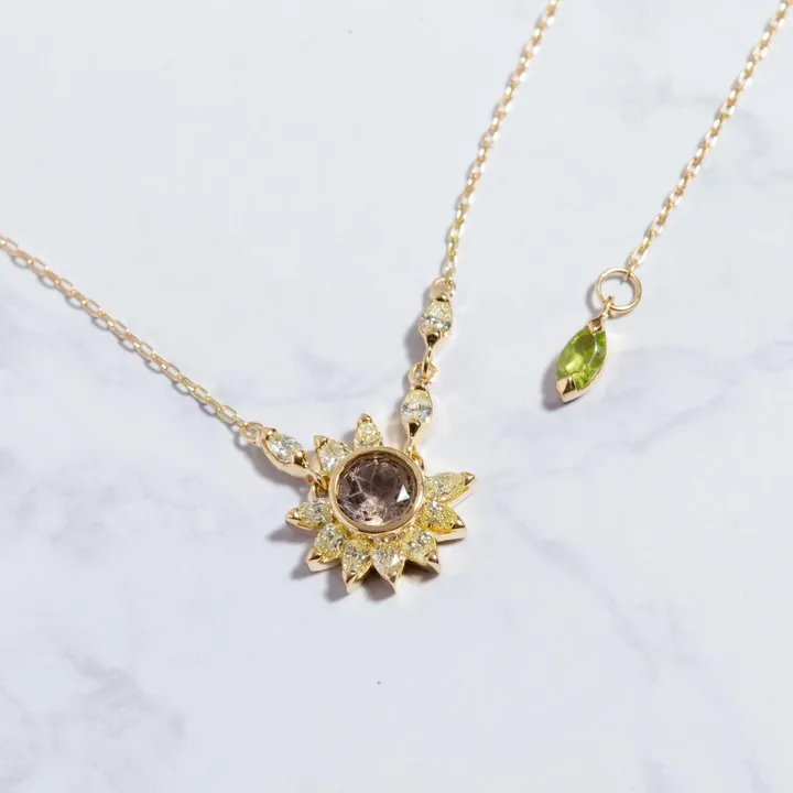 〈太陽光のように煌めくイエローダイヤモンドネックレス〉 英語で「Sunflower(太陽の花)」というひまわりをモチーフにイエローダイヤモンドをあしらい、太陽の光のような透明感のある輝きをプラスしたひまわりネックレスです。 1本の向日葵の花言葉は「一目惚れ」、思わず目を奪われる一品に仕上げました。 バック部分には、葉モチーフのペリドットあしらい、夏服など首元のあいたバックスタイルの時も抜け目のないデザインです。 〈目指したのは“ブラウンの瞳に似合うジュエリー”〉 周りのイエローダイヤモンドの煌めきは勿論、中央の日本の職人による特殊カット「ダンデライオンカット」のスモーキークォーツの吸い込まれるような輝きが魅力的な、適度なサイズ感が大人なひまわりネックレス。 ネックレスの後ろの葉モチーフには若葉のような明るい緑の輝きの8月誕生石ペリドットをあしらいました。