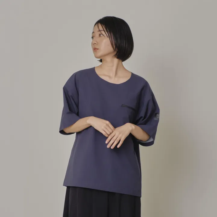 カジュアルにもキレイめコーデでも着用できる防水Tシャツ。 本格アウトドア用に匹敵する耐水圧と透湿性を備えた「BARRIER EFFECT.」によって水分含浸を防ぎつつ、衣服内の蒸れを素早く解消してくれる。 素材自体はもちろんの事、縫い目にも裏面からシームテープを貼っている為、縫い目からの雨や風の侵入も無し。 また、フロントや衿、袖、ポケット部分、裾回りなど極力縫い目を表に見せないよう接着などでスッキリ見た目の仕上がり。 袖付け、脇などの生地合わせ部分は超音波接着技術により段差が無くフラットな仕上がり。 左胸にはスマートフォンも入る止水ファスナー付きポケット。 突然の雨や少し肌寒い日の防寒着としても着用できる非常に使い勝手の良いアイテム。