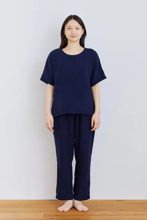 先行して展開していたルームパンツをご愛用の方々をはじめ、たくさんのご要望をいただいておりましたトップスが、ようやく発売となりました。 サラッとした着心地で、ふわふわの肌触りが地肌に気持ちよく、春夏のシーズンにぴったりです。 身幅と、袖丈、アームホールがやや大きめのつくりで、ざっくりとしたシルエットのデザインなので、体のラインを拾いません。 また、ネックホールは着脱時のストレスがない、ややゆったりめの仕様ですが、かがんだ姿勢でも開きすぎないつくりです。 着丈は(長袖に比べて)少し短いつくりになっています。 全工程日本製、ホルマリン検査済みで、敏感肌の方でも安心してお使いいただけます。 パジャマ、部屋着などルームウェアとして、そして、ちょっとそこまでお出かけするワンマイルウェアとして、くらしの中のいろんな場面で活躍してくれます。 部屋干しでも乾きやすいので、それほどたくさんの洗い替えも必要ありません。 いつもどおりのお洗濯方法で遠慮なく洗えます。 シワも気になりづらい生地なので、ぜひ気兼ねなくいろんなシーンでお使いください。 サイズはS、M、L、XLがあります。男女兼用となっています。身長やお好みのサイズ感に合わせてお選びください。